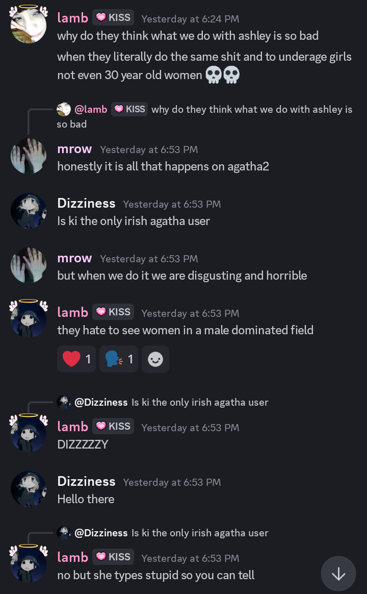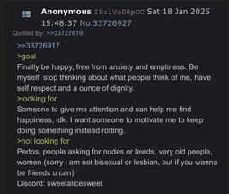 >the one who shall not be namedand to the child P, (tho I think I can say her name here? idk not taking my chances), im sorry I never got to talk to you, know you, nor could protect you. I dont know what to say but when I saw your pictures when you were actively "becoming" an e girl, and the first time I saw your face, I thought you were cute but clearly looked underage (I think you still are? I dont know) and the replies of every male disregarding that and thirsting after you made me so disgusted. like, any adult could tell you were/are a kid. theyre not complimenting you, saying youre mature, and shit like that because they think youre so exceptional and awesome. no. youre just easy, easy enough to manipulate and make a victim. you are a strong girl, dont bother with any of them. dont forget you can overcome any terrible thing that happened to you, or will happen to you. I am saying this hoping I am incorrect, hoping that nothing bad will happen to you; but sadly I know from experience what it is like to be a child on here. I hope you are doing well. if you ever need anything talk to me on my email or discord or twitter, anywhere. you can find the information on my thread.