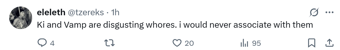 >vampim sorry vamp if I bothered you or tried to alienate you years before when you trusted me with the knowledge of your age, but I truly wished the best for you. in our core we are all showing very much attention seeking behavior and I always hoped I didnt end up like this, and I think its because I always looked up to my older sisters on the internet (ancient egirls and whatnot). but they didnt protect me. I tried to protect you because I saw my younger self in you and I was scared I was actively influencing someone to become like me and I wouldnt wish that to anyone. when I learned dellastelle started talking to you my heart sank. im truly sorry.