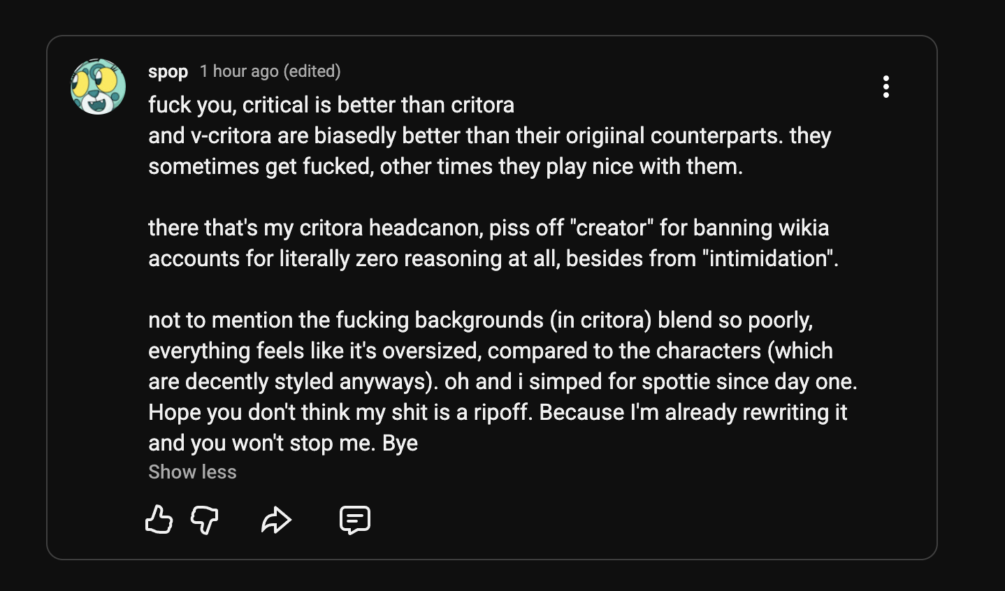 even if its just making you angry enough to spam deviantart and lose a prime diddling account or angry enough to beat your wranglers and get you another trip to the nut house