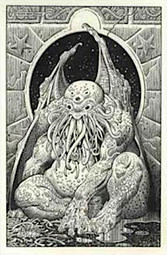 The bas-relief was a rough rectangle less than an inch thick and about five by six inches in area; obviously of modern origin. [...] Above these apparent hieroglyphics was a figure of evident pictorial intent, though its impressionistic execution forbade a very clear idea of its nature. It seemed to be a sort of monster, or symbol representing a monster, of a form which only a diseased fancy could conceive. If I say that my somewhat extravagant imagination yielded simultaneous pictures of an octopus, a dragon, and a human caricature, I shall not be unfaithful to the spirit of the thing. A pulpy, tentacled head surmounted a grotesque and scaly body with rudimentary wings; but it was the general outline of the whole which made it most shockingly frightful.