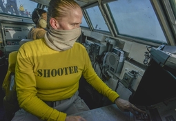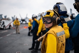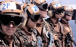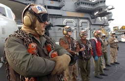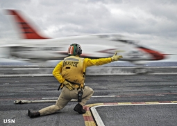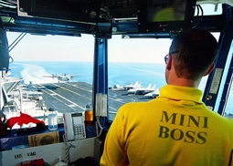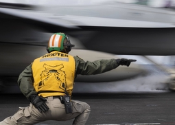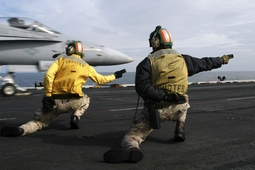 Самыми колоритными персонажами на палубе являются офицеры в желтом жилете и зеленом шлем - офицеры катапульты - "shooters" - Catapult and Arresting Gear Officer.
